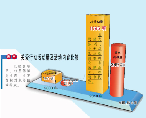 首届深圳关爱行动开始后6年多来,深圳关爱行动共举办9000多项爱心活动,吸引上千万人次热情参与。而上月拉开温馨大幕的第七届关爱行动的项目达到了历届之最,有1000多项。7年来,深圳关爱行动共举办爱心活动超过10000项。其中,2010年的活动总量比2003年首届关爱行动的活动总量增长了7.5倍;重点活动项目则增长了14倍,内容从较为单一的扶弱助贫拓展到对各个人群的关爱(见表三)。