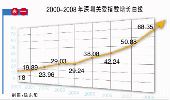 从2000年开始,有关部门对深圳的关爱指数进行研究和测量,现在又在制定一个评价关爱之城、评价爱心的指标体系。研究和测量结果表明,从2000年到2008年,深圳关爱指数增长的曲线一直在快速上升——从2000年的18上升至2008年的68.35。其中2008年,深圳的关爱指数是68.35,和2007关爱指数比,增幅高达34.34%,是同期GDP增长速度的将近3倍?。硪唬?/p>