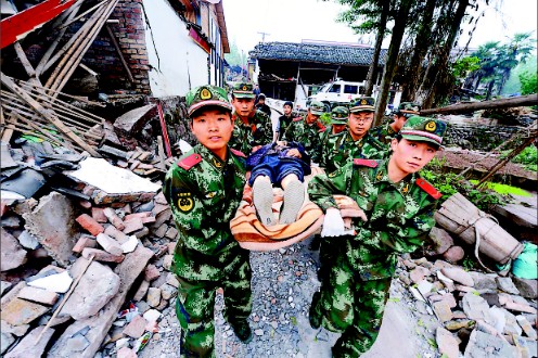 昨天上午,余震突发。芦山县古城村古城坪村民小组,雅安武警把受伤的村民送往救护所。