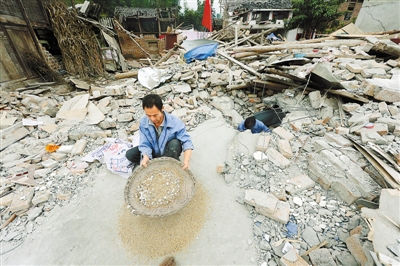 昨天上午,芦山县龙门乡古城村月光山村民小组的骆大孝在自家屋子的废墟上用筛子筛谷子,他的妻子则在倒塌的废墟里一点一点的往外掏谷子。