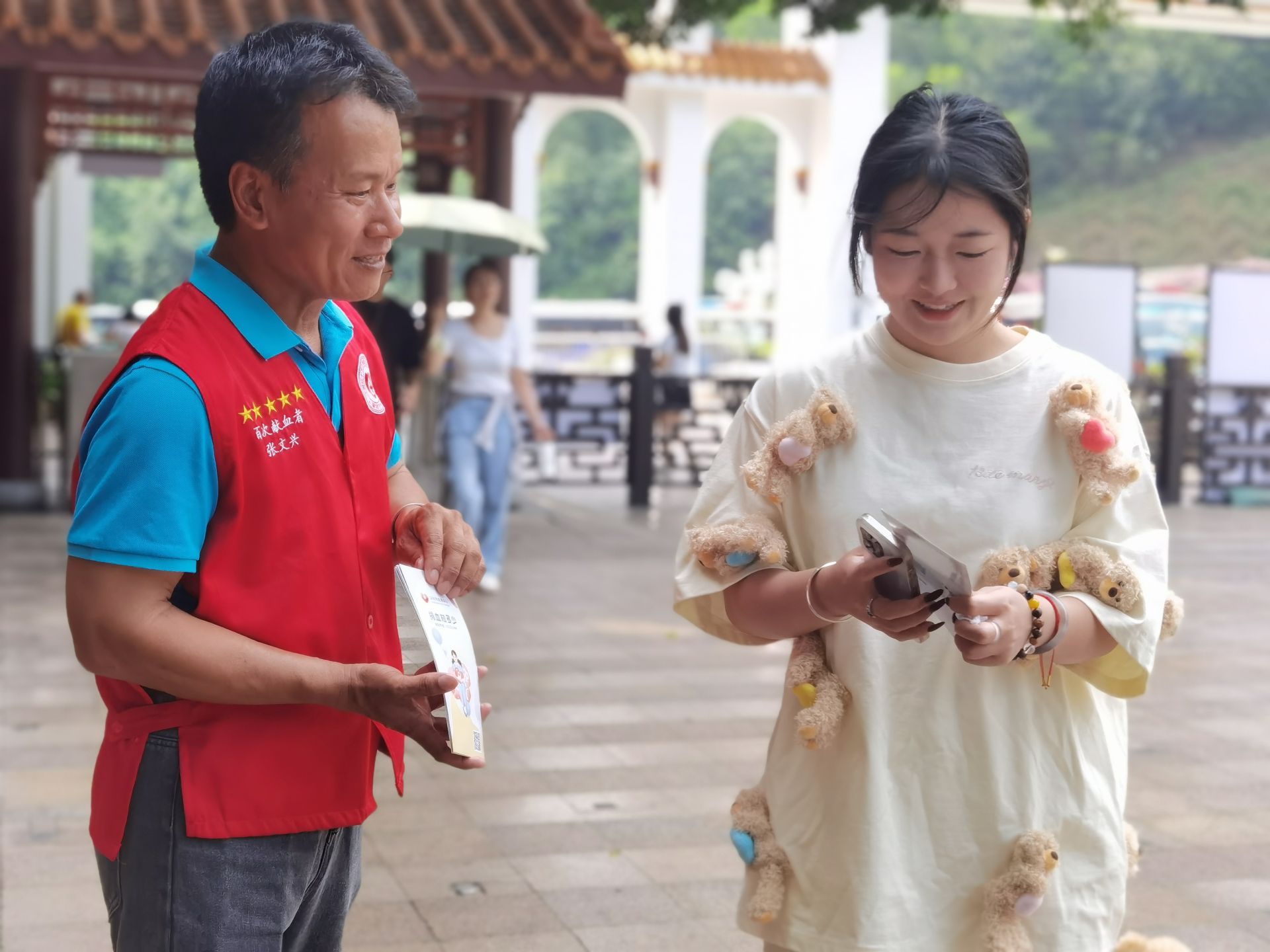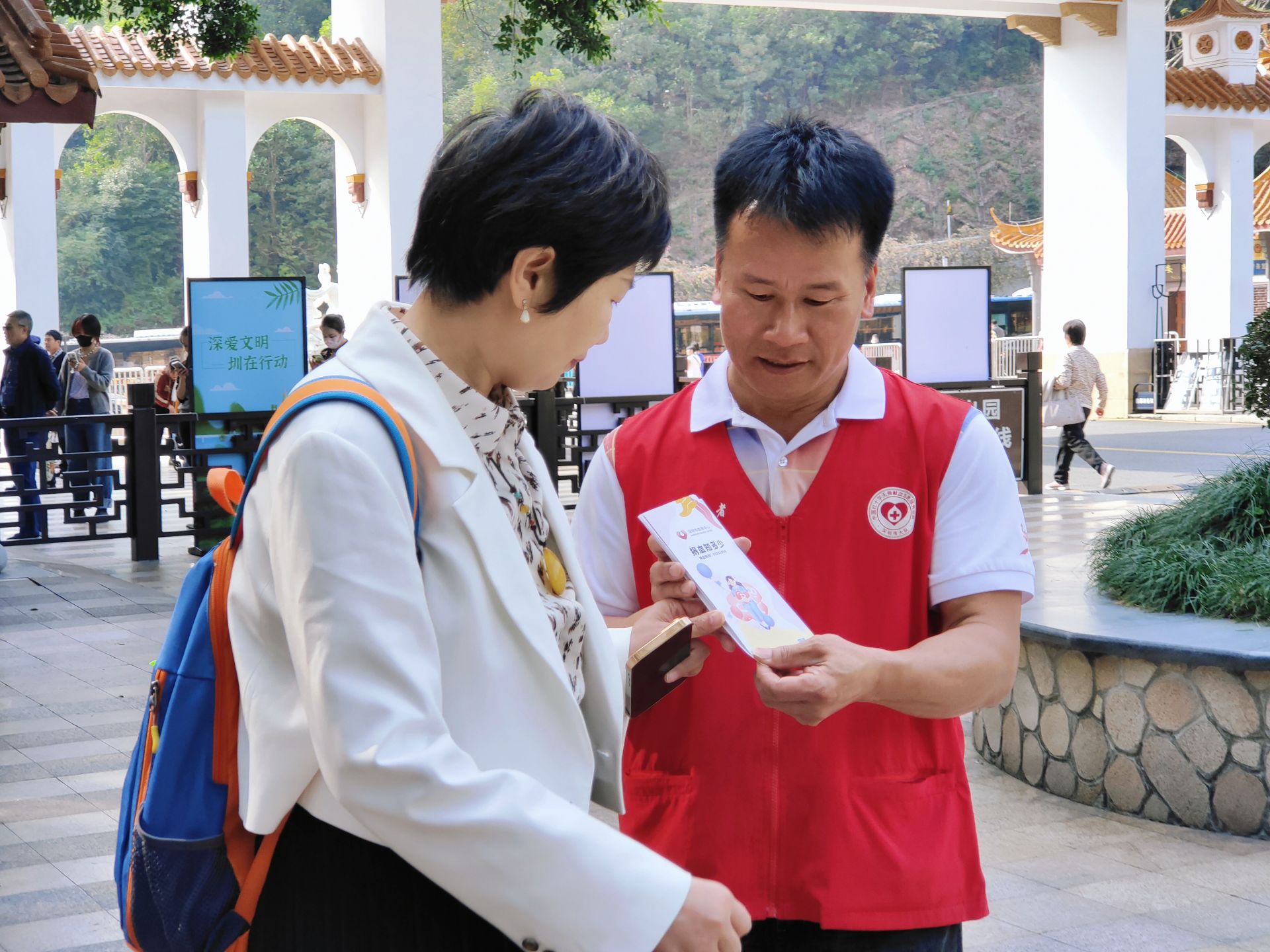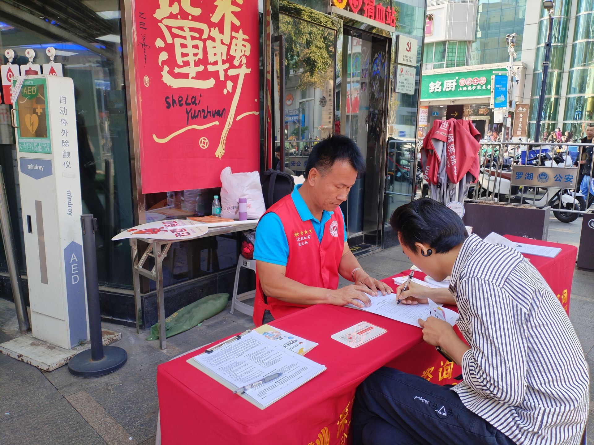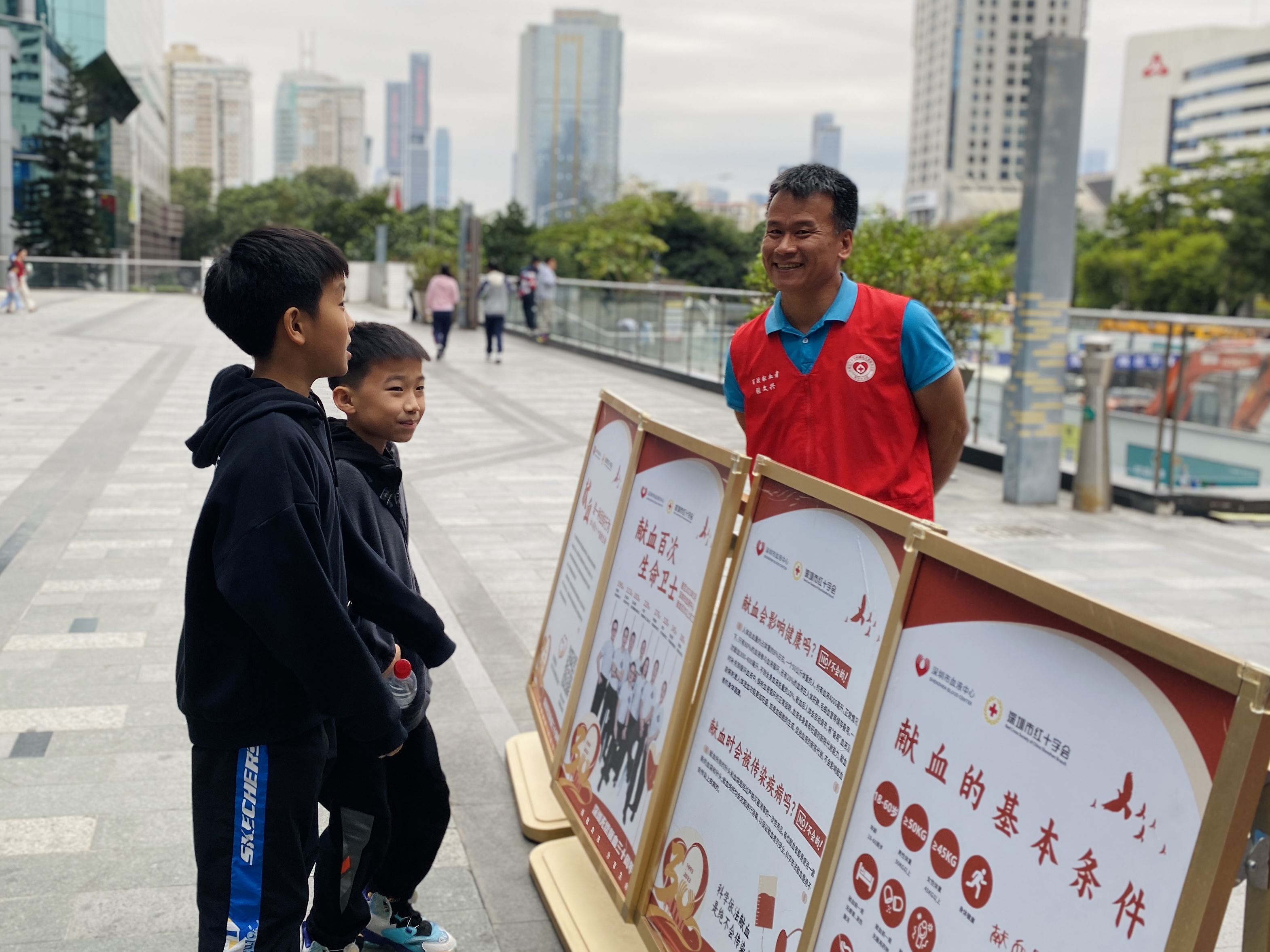 在长期献血过程中,志愿者的暖心服务让张文兴深刻体会到:“献血百次,不如劝人献血一次”。2023年,他主动加入深圳市红十字会无偿献血志愿工作者服务队,从无偿献血者,成长为志愿工作者。无论高温酷暑还是台风暴雨,他总是坚守在街头献血点,用自己的亲身经历积极宣传、主动招募,带动更多市民加入无偿献血行列。“记得有位年轻人听完我的故事后,不仅自己献血,还拉着伙伴一起来,那一刻我明白,爱心能传递,只要人人都献出一点爱,世界将变成美好的人间。”张文兴感动地说。截至目前,他的累计志愿服务时长已达4470小时。在两年多的时间里,他有超过600天坚守在志愿服务一线,有捐血者开玩笑说他是“长期经过太阳炙烤的人”。