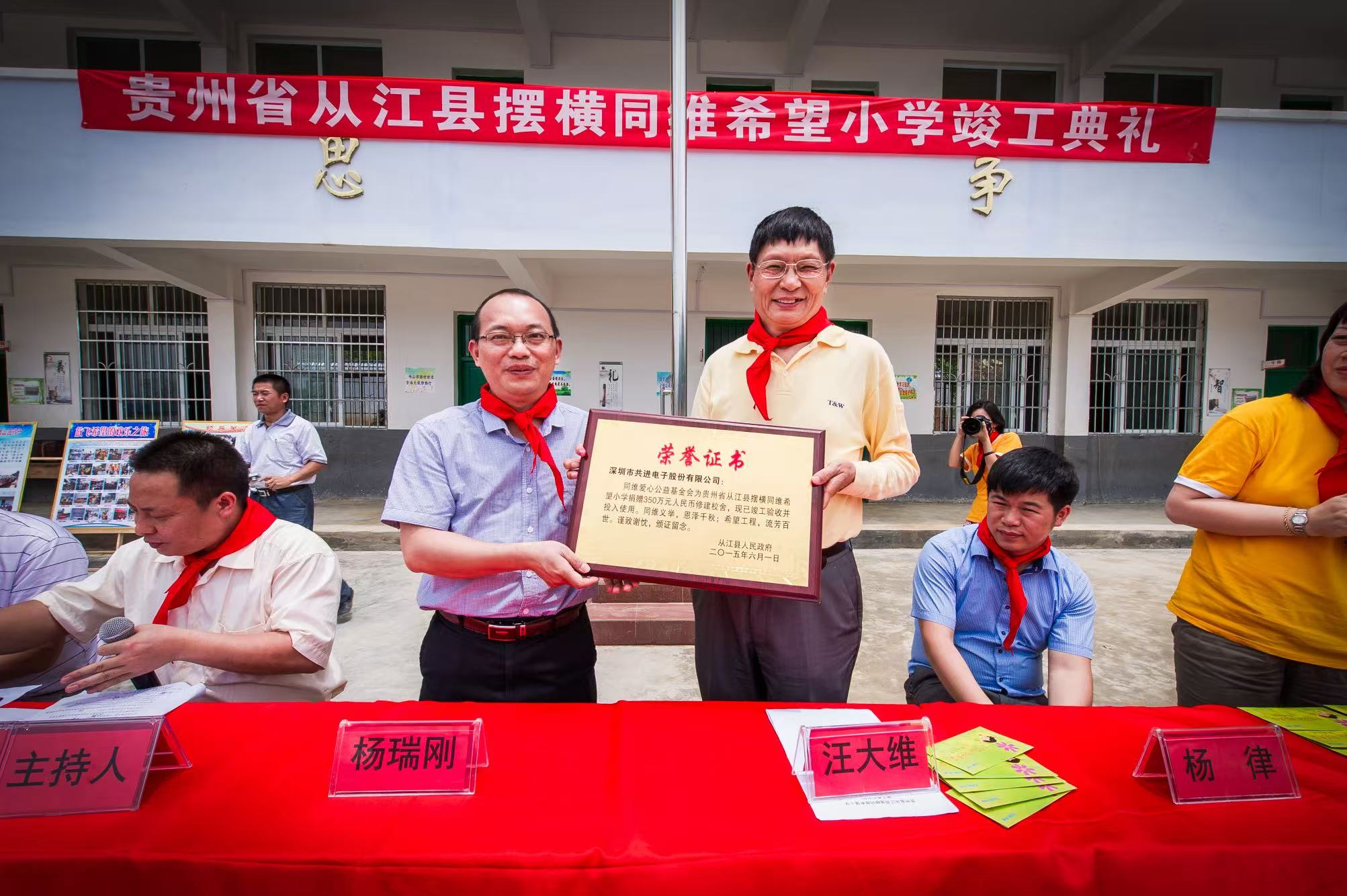 这所同维希望小学最初由公司于2008年援建。多年来,汪大维带领基金会和企业员工,持续从硬件和软件等方面对学校进行长期帮扶。2023年,在一次实地调研中,为推动学校进一步发展,他决定再次扩容校园、建设新楼。每年,他都会亲自深入西部山区,走访调研同维希望小学的现状与实际需求。